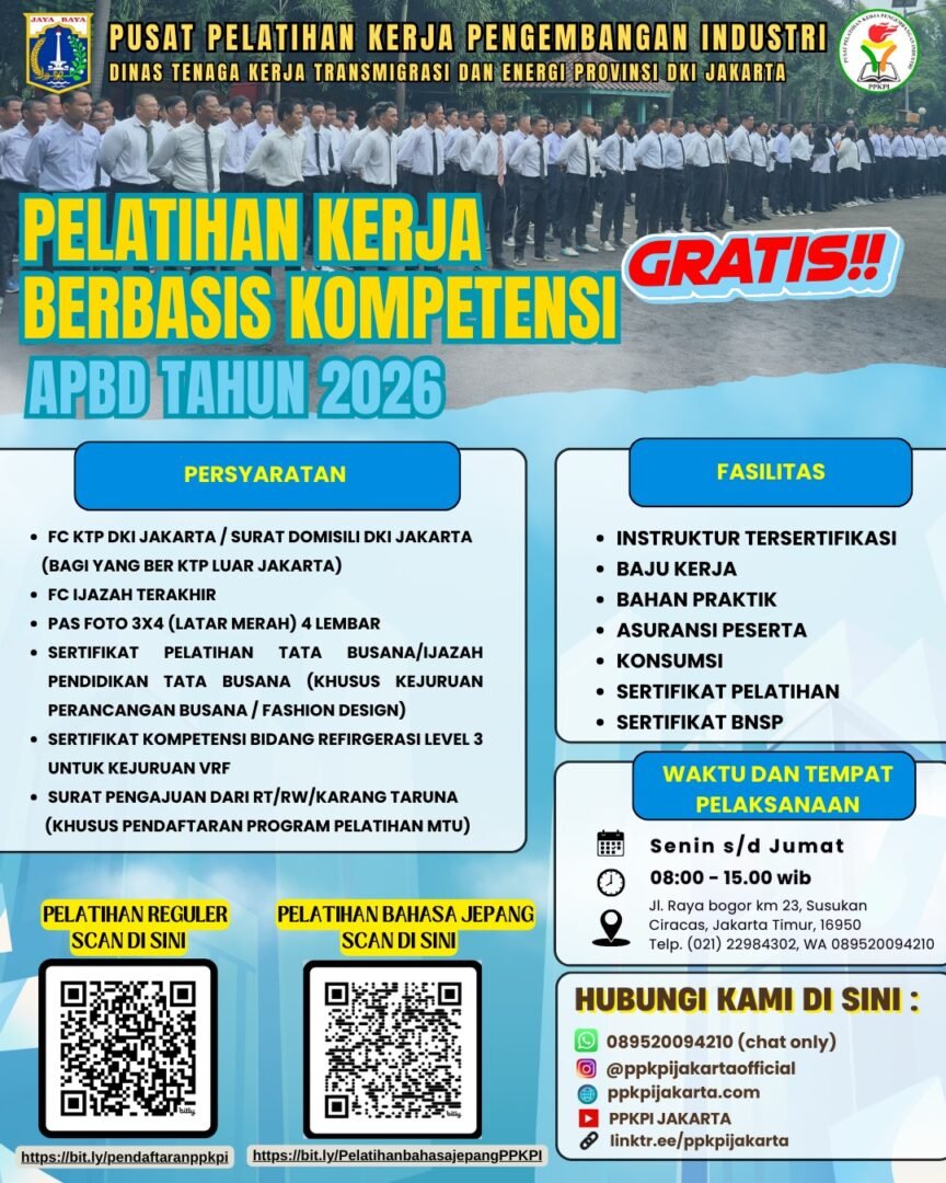 PPKPI | Pusat Pelatihan Kerja Pengembangan Industri adalah Lembaga Pelatihan Kerja (LPK) Pemerintah yang memberikan pelatihan gratis khusus untuk warga DKI Jakarta sesuai dengan Peraturan Gubernur DKI nomor 57 Tahun 2022 . Visi kami adalah “Mewujudkan PPKPI sebagai Center of Excellence, Center of Development, di bidang pelatihan dan uji kompetensi tenaga kerja dalam rangka peningkatan kompetensi tenaga kerja.”
